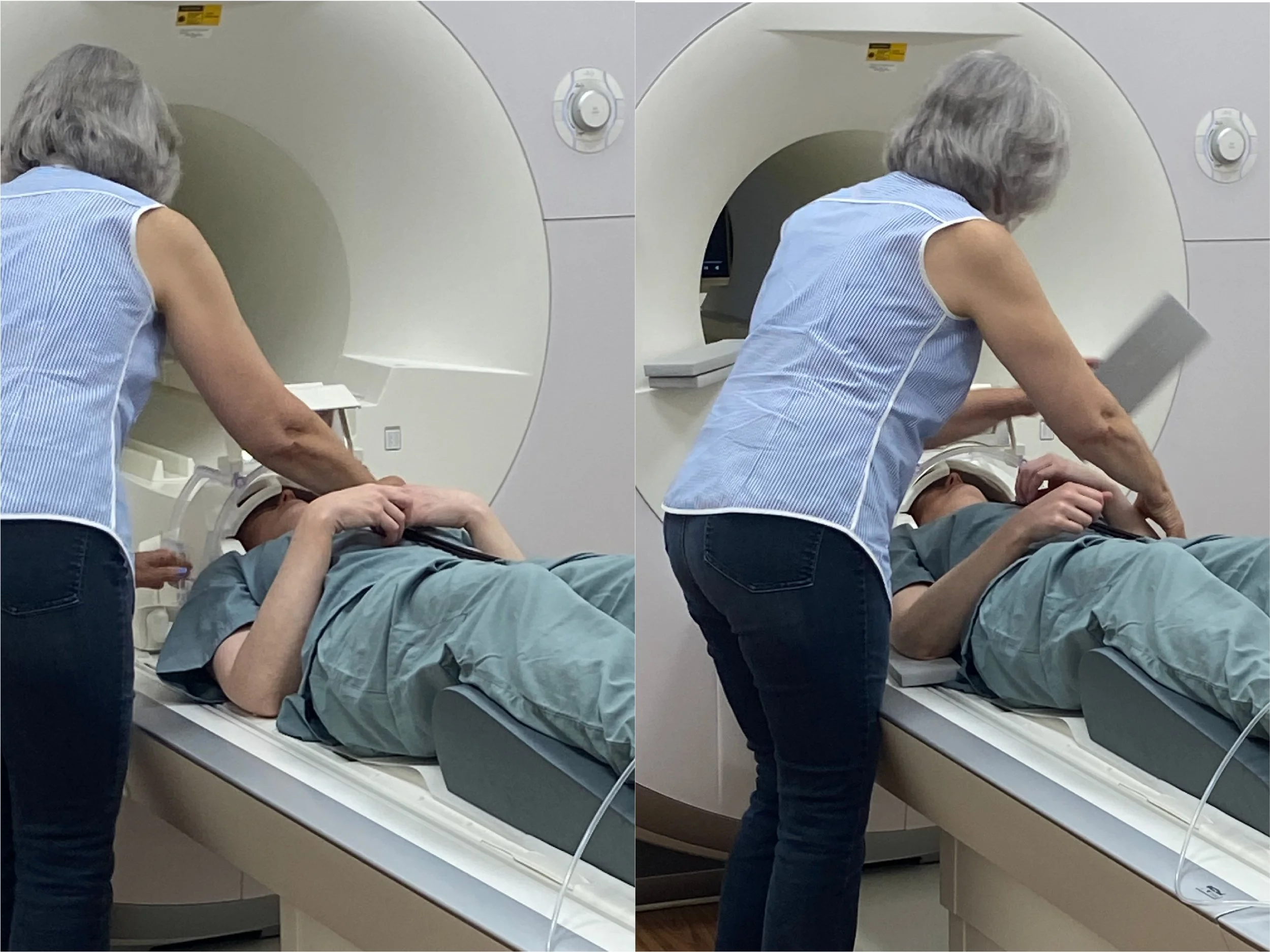 She will slide some cushioned pads on either side of your head to help you hold your head still, and place some other cushions along the insides of your arms (right).